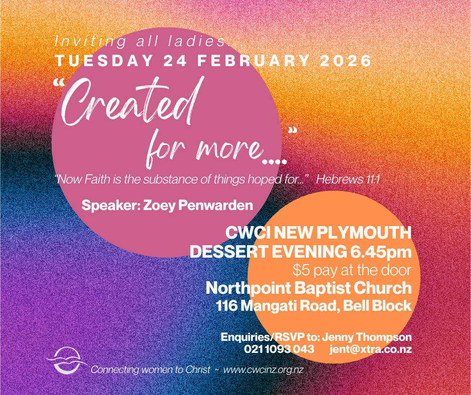 Created for more… 24 February 2026 New Plymouth CWCI New Plymouth team invite ladies to our next event on Tuesday 24 February – we look forward to seeing you there!